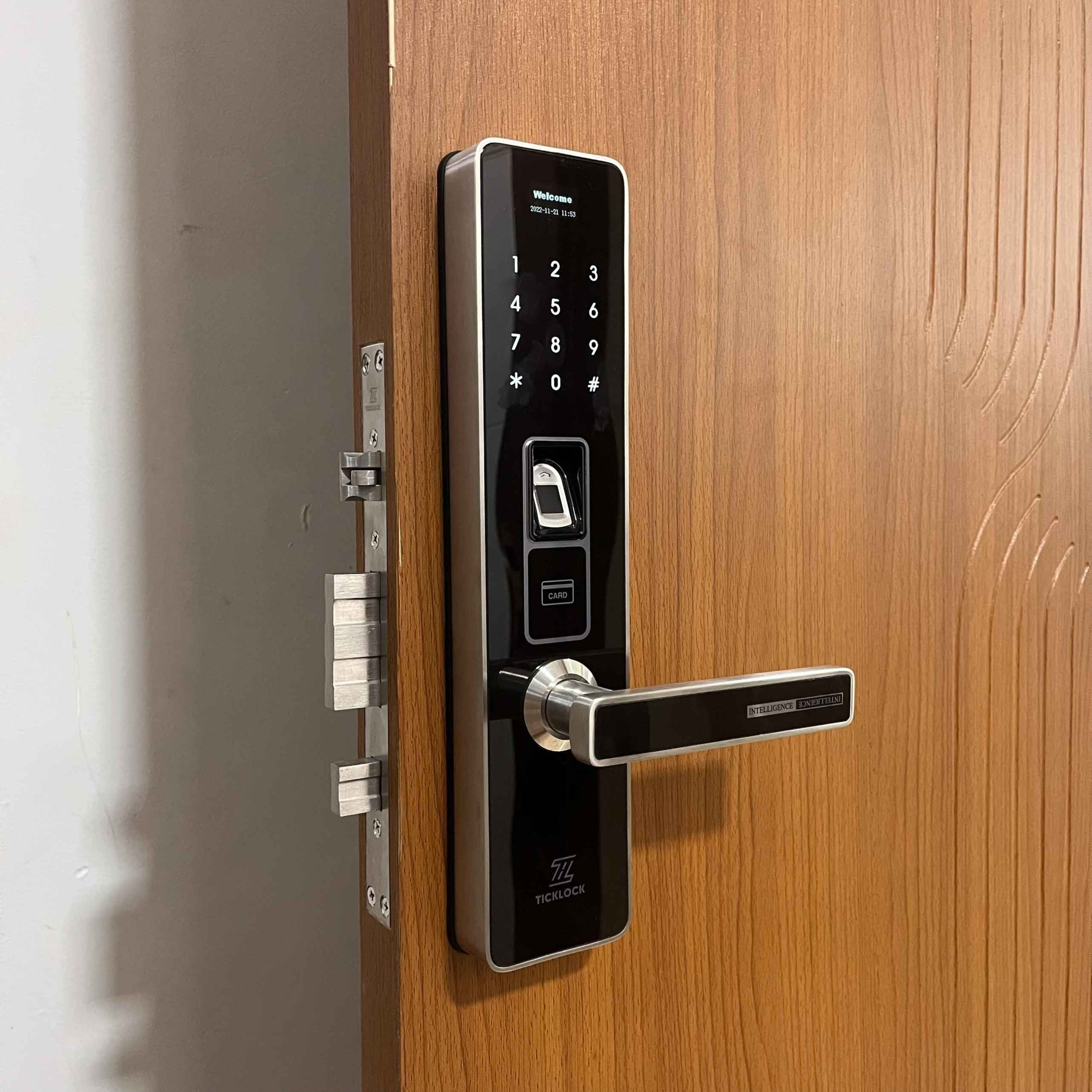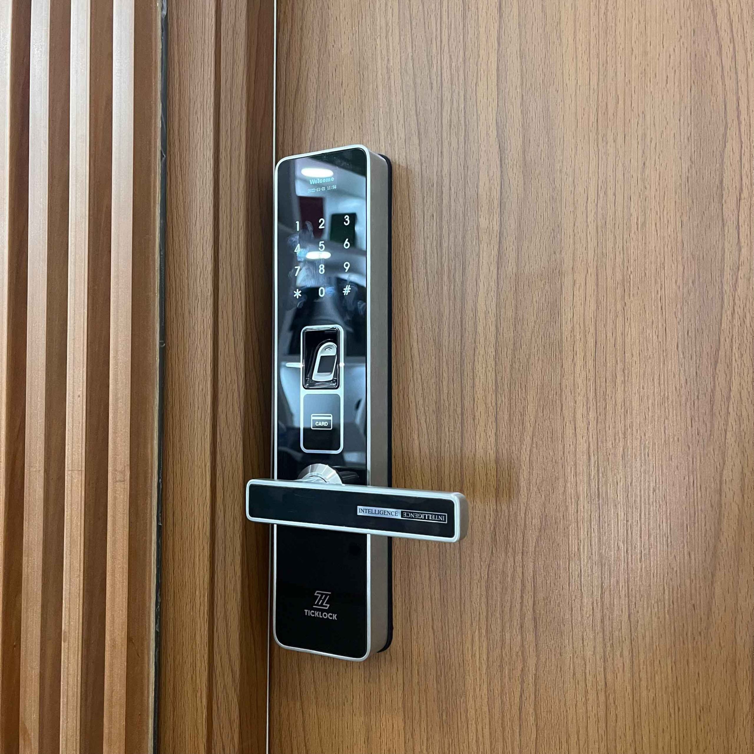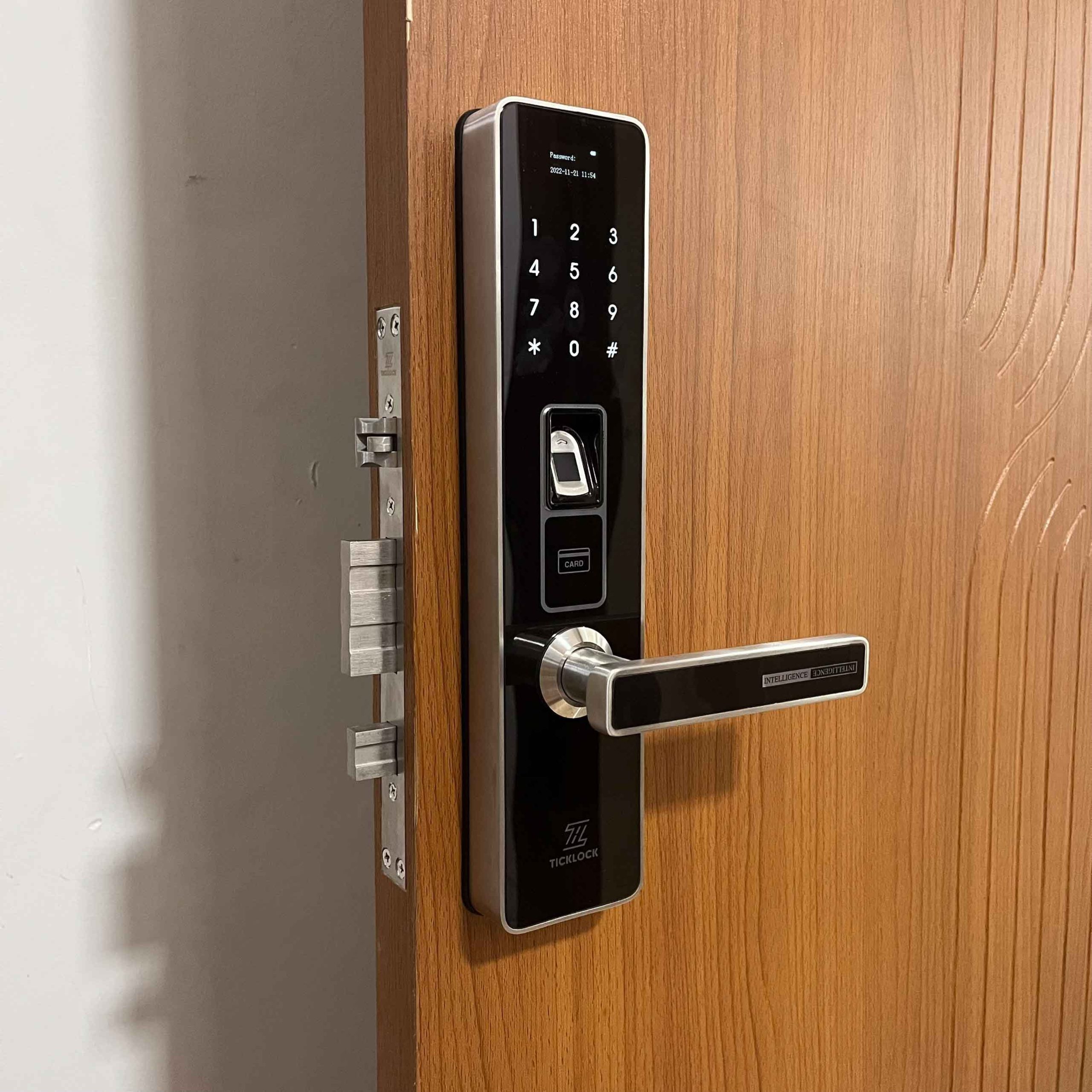 Khóa cửa thông minh TICKLOCK VIỆT NAM SMA-07 với tính năng 5 trong 1, có thể được mở khóa bằng: vân tay, mật mã, thẻ từ RFID, chìa khóa cơ dự phòng và tích hợp qua điện thoại mở khóa từ xa.